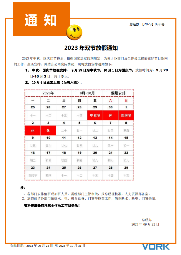 2023 Mid-Autumn Festival and National Day Holiday Notice