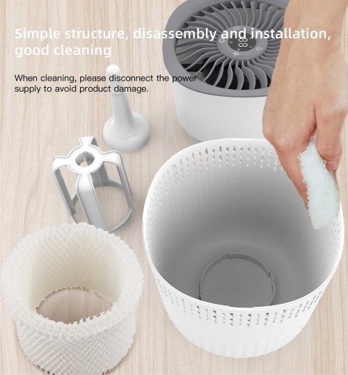 The humidifier adopts the evaporative humidification technology, which atomizes the water into fine water droplets instantaneously through the ultrasonic vibration of high-speed rotation, and rapidly diffuses into the room under the push of the fan to achieve the purpose of rapid humidification. Compared with the traditional gasification humidifier, this humidifier can not only keep the relative humidity constant, but also has a good energy conversion efficiency, power saving and environmental protection.