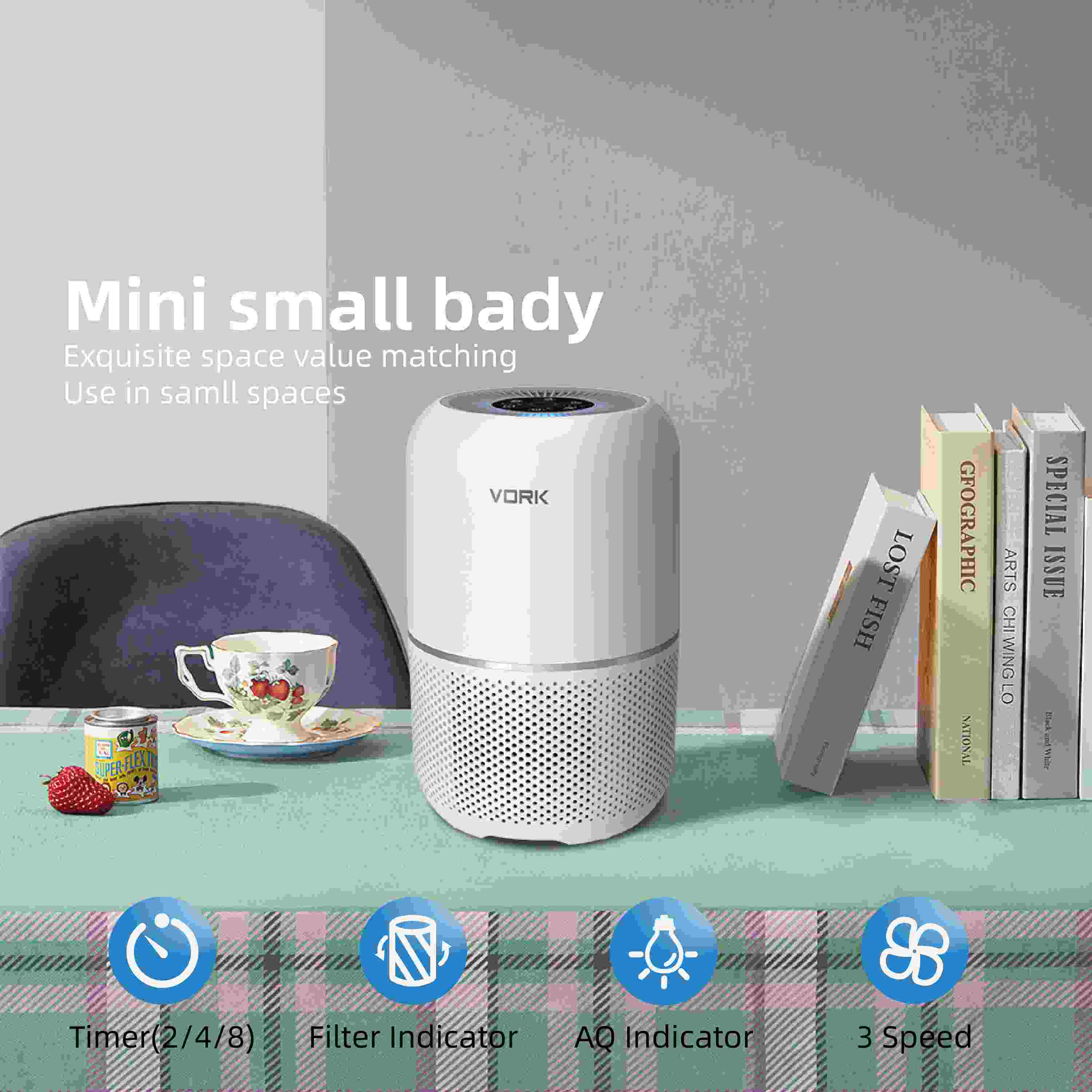 The VORK air purifier adopts an advanced multi-layer filter system, including a pre-filter, HEPA high-efficiency filter, and activated carbon filter. The pre-filter effectively traps large particles of dust and hair; the HEPA filter can capture over 99.97% of fine particles as small as 0.3 microns, such as PM2.5, pollen, and dust mites; the activated carbon filter effectively adsorbs harmful gases like formaldehyde and benzene, ensuring the air is fresh and odor-free.