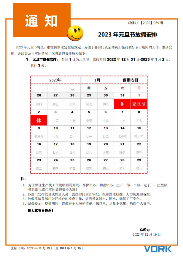 Entsprechend der spezifischen Situation unseres Unternehmens sieht die Feiertagsvereinbarung des Unternehmens zum Frühlingsfest wie folgt aus: